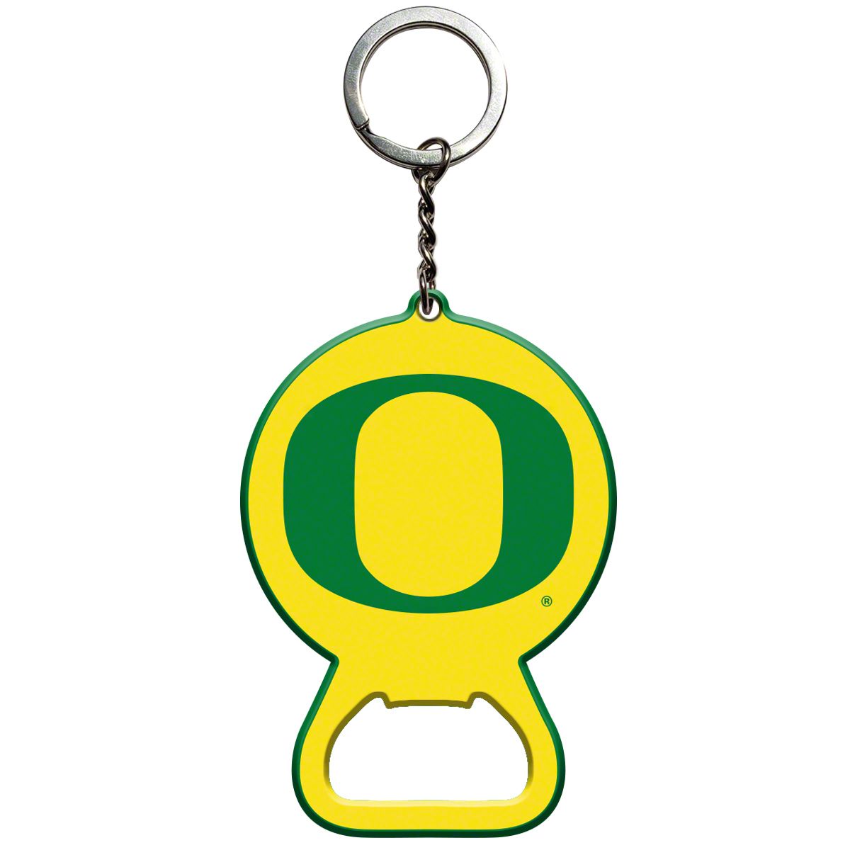 Construction and Appearance. Featuring a sturdy design with a built-in bottle opener, this keychain is finished in the University of Oregon's green and yellow color scheme. The durable construction ensures long-lasting use while the officially licensed logo showcases your school loyalty.