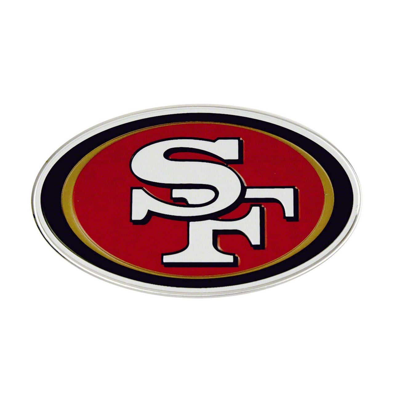Look and Build. This 3D embossed emblem was manufactured using aluminum and measures 3.25 x 3.25 inches. This 49ers Emblem is the legendary 49ers logo that shows "SF" in white inside a red oval with gold and black around the perimeter of the oval..