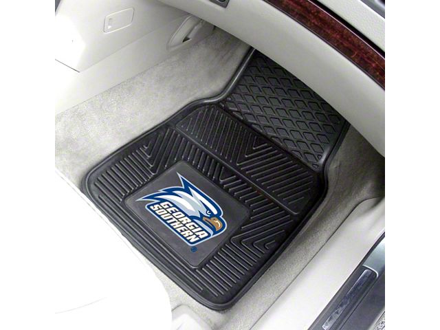 Construction and Features. Made from high-quality vinyl, these mats are built to withstand everyday wear and tear. The matte black finish provides a sleek look that complements any interior, while the 17 x 27-inch size ensures ample coverage for the front floor area. The Georgia Southern University logo adds a unique and collegiate flair to your vehicle.