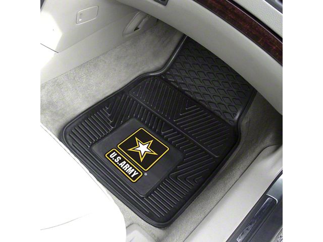 Construction and Appearance. Crafted from heavy-duty vinyl, these front floor mats come in a matte black finish with a prominently displayed U.S. Army logo for a bold visual statement. Sized at 17x27 inches, they provide ample coverage for the front footwells while resisting water, mud, and wear. The textured surface helps trap debris and provides slip resistance underfoot.