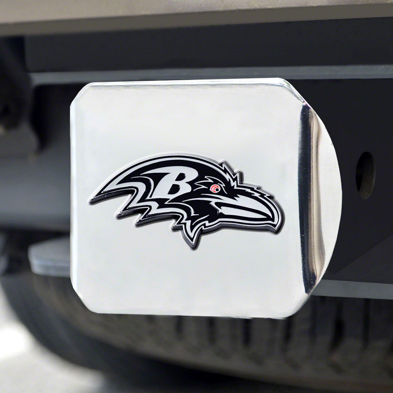 Description. Automotive Accessory; Hitch Cover; Chrome; Nfl; Baltimore Ravens; 3.4"X4"
