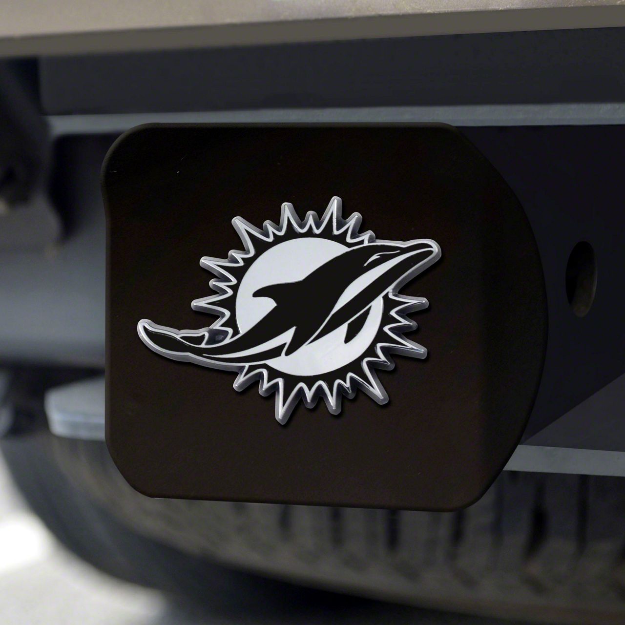 Construction and Appearance. Crafted from durable metal materials, this hitch cover features a sleek black finish. The centerpiece is a molded 3D chrome Miami Dolphins logo, adding a touch of elegance to your vehicle.