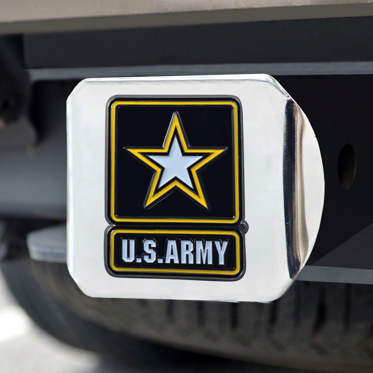 Description. Hitch Cover; Color Hitch Cover; Chrome; U.S. Army; 3.4"X4"