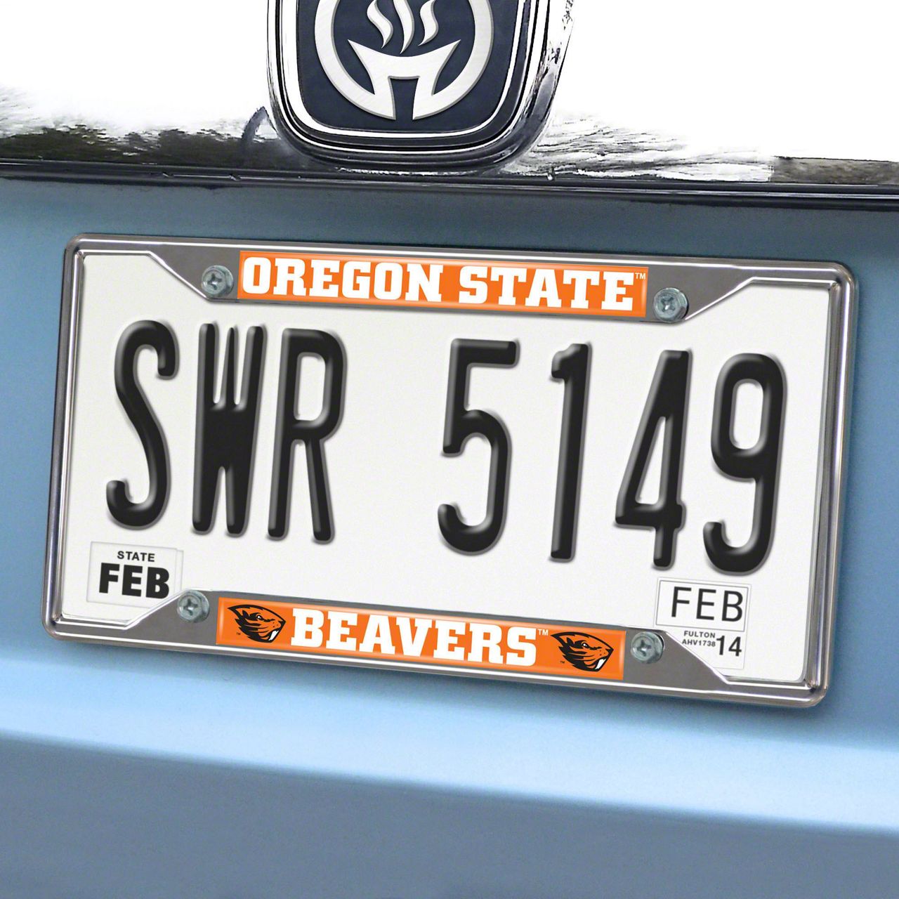 License Plate Frame with Oregon State University Logo; Chrome (Universal; Some Adaptation May Be Required)