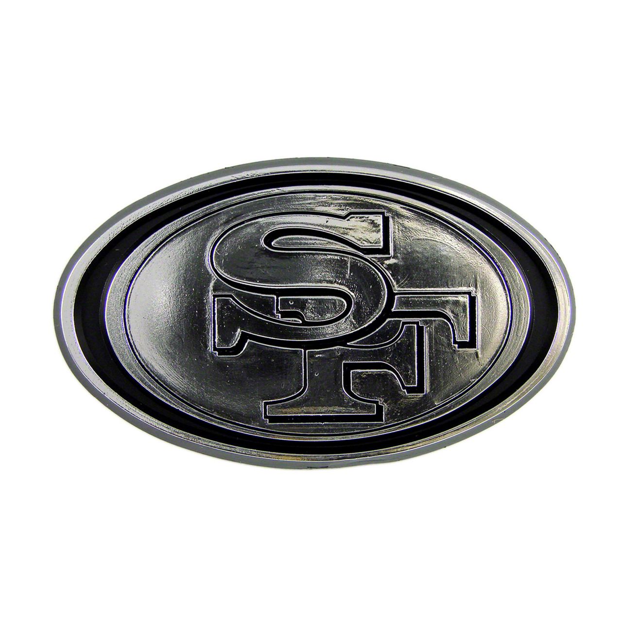 Creation. This San Francisco 49ers Molded Emblem was formed from plastic with a chrome-plated, UV-protected finish that is modern and stylish. The emblem measures approximately 3.25 inches x 3.25 inches for an easy fit wherever you like, not just your vehicle.