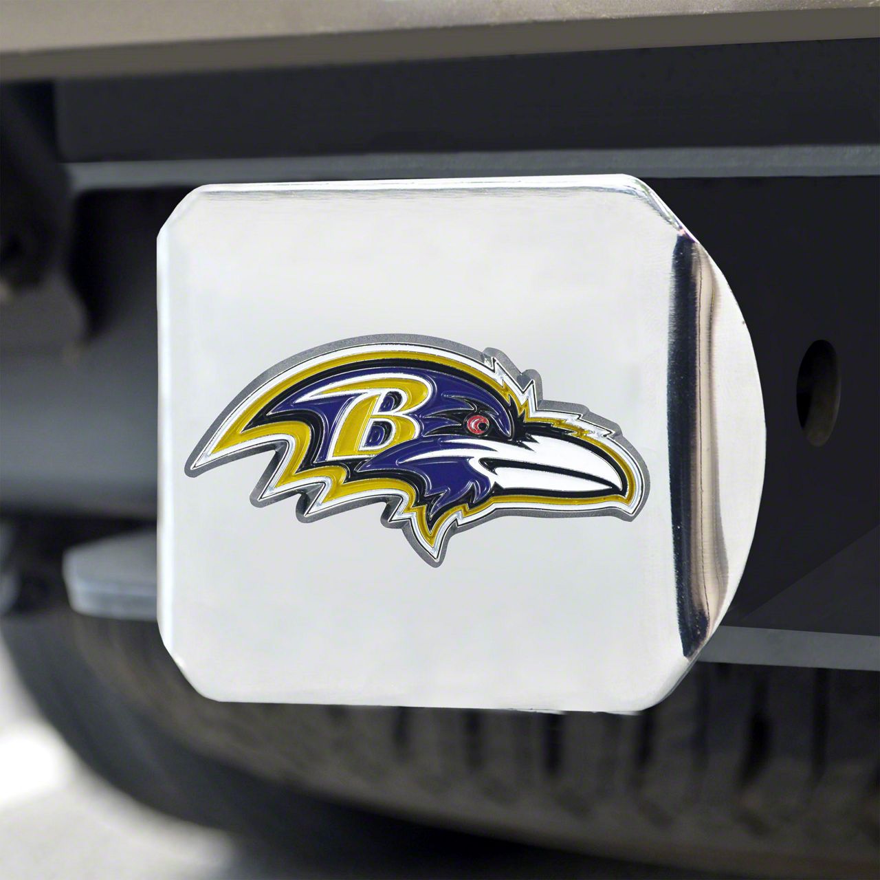Description. Automotive Accessory; Color Hitch Cover; Chrome; Nfl; Baltimore Ravens; 3.4"X4"