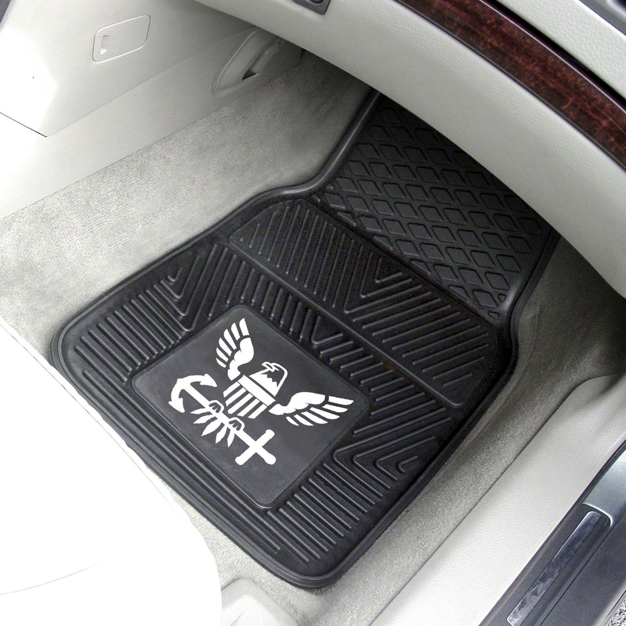 Application. These Vinyl Front Floor Mats with U.S. Navy Logo are a universal fitment product; some adaptation may be required depending on your vehicle’s make and model.