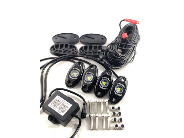 Description. Our Award Winning RGB Rock Light Kit includes lights, Harness with waterproof connectors and mounting hardware. Heavy duty housing are built to width-stand the abuse while mounted in your wheel well. They are IP68 and shock proof, so mud and rocks will not be an issue. The kit comes with all the gaskets and hardware for a easy install. This kit is controlled via bluetooth that you can control from your phone. The RGB Rocklights feature allows you to run numerous colors from White,Red,Green,Blue, and everything in-between the spectrum. We offer this kit in a set of 4, 6, 8, 12, 16, 24, 32, and 40.