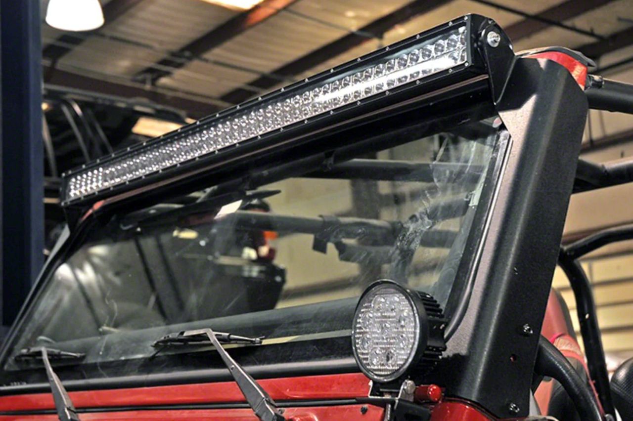 Secure and Steady. For a secure and stylish way to mount your light bar, check out the FCKLightBars 50-Inch Windshield Light Bar Mount. This set of brackets will safely hold your 50-inch light bar. It’s designed to be placed on your Wrangler TJ’s upper windshield, spanning the full width of your roof.