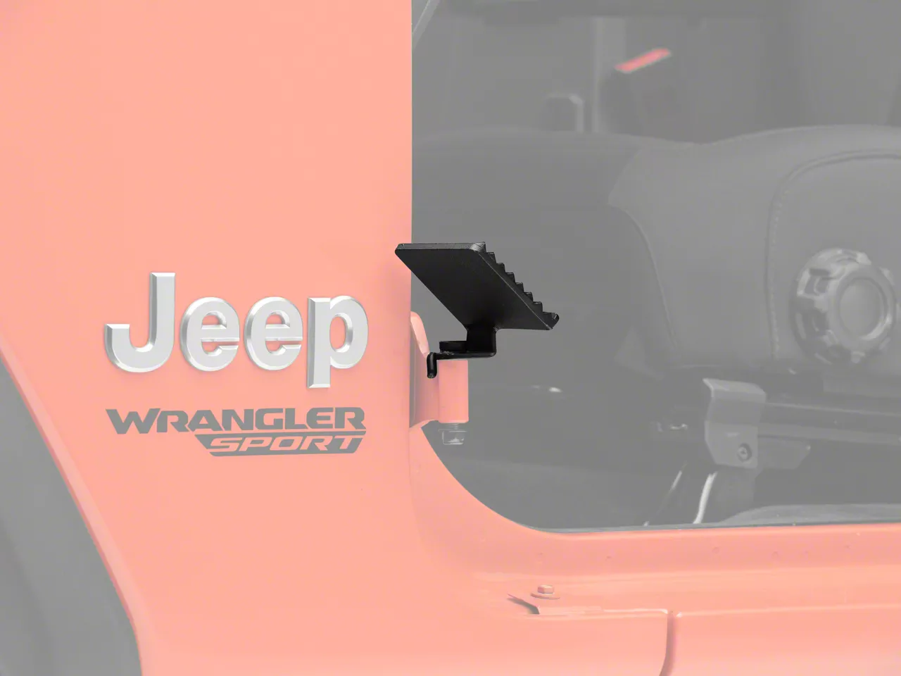 Easy Installation. These foot pegs are easy to install and don’t require you to perform any modifications. Once you remove your Jeep’s doors, you can directly mount each foot peg to your factory door hinges. To secure the foot pegs in place, fasten them using the supplied nuts and washers.