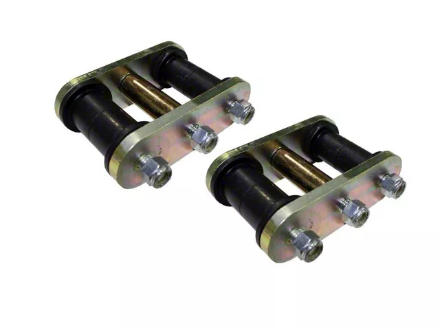 Sturdy Build Quality. These leaf spring shackles are manufactured from 0.375-inch plate steel, offering superior strength. These components are then machine-formed to exact measurements for an accurate fit when installed. The included steel bushings are similarly machine-formed, offering reliable tight-fitting performance. Meanwhile, the polyurethane bushings are constructed using a specialized injection molding technique, making these particularly tough. Finally, the steel components receive a yellow zinc-plated finish for exceptional protection against rust.