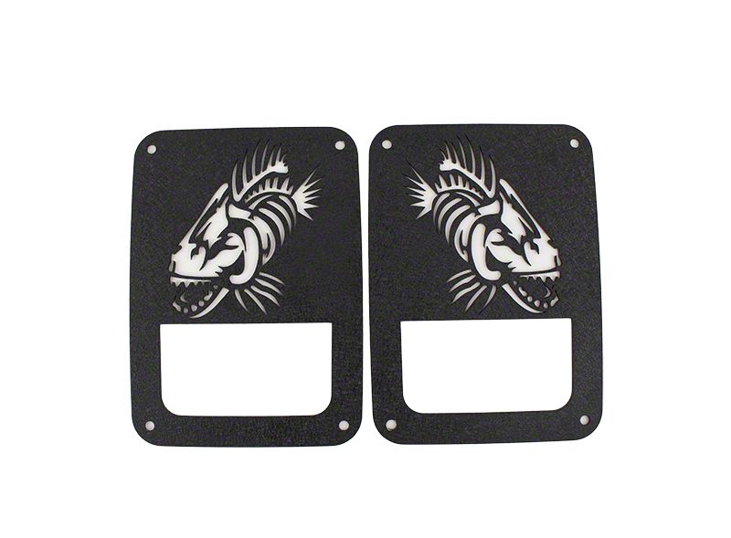 Application. These Fishbone Offroad Taillight Covers - Textured Black are designed to fit the 2007–2018 Jeep Wrangler JK models. They are sold as a pair.