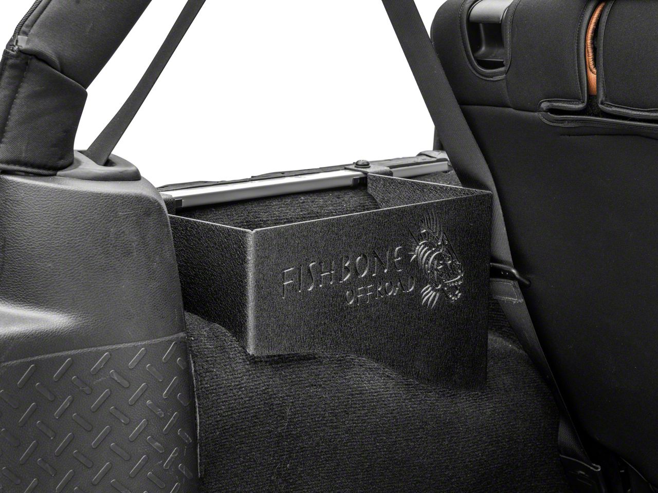 Provides Extra and Secure Storage Space. The appropriately named Fishbone Offroad Wheel Well Storage Bins make great use of the remaining space in the cargo area of your Jeep Wrangler JK 4-door. Installing on the wheel wheels, this pair of bins provide secure storage for your smaller items, thus preventing them from sliding all over the cargo floor.