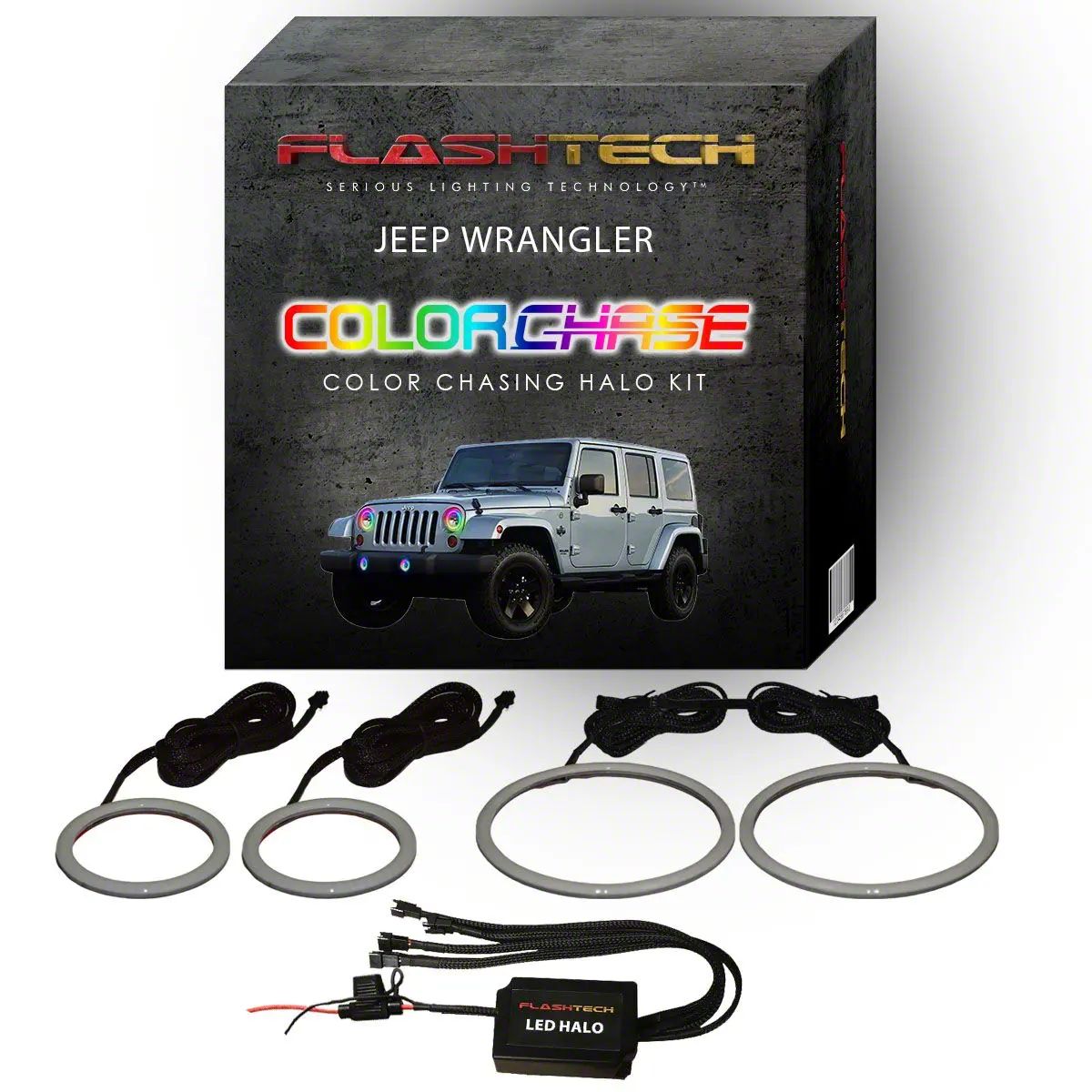 Innovative Lighting Upgrade. The Flashtech ColorChase LED Halo Headlight and Fog Light Kit; RGB brings vibrant, customizable illumination to your vehicle’s existing headlights and fog lights. Designed to enhance both the aesthetic appeal and visibility, this lighting solution offers advanced controls with dynamic color and pattern options, allowing users to personalize their Jeep’s lighting effortlessly.