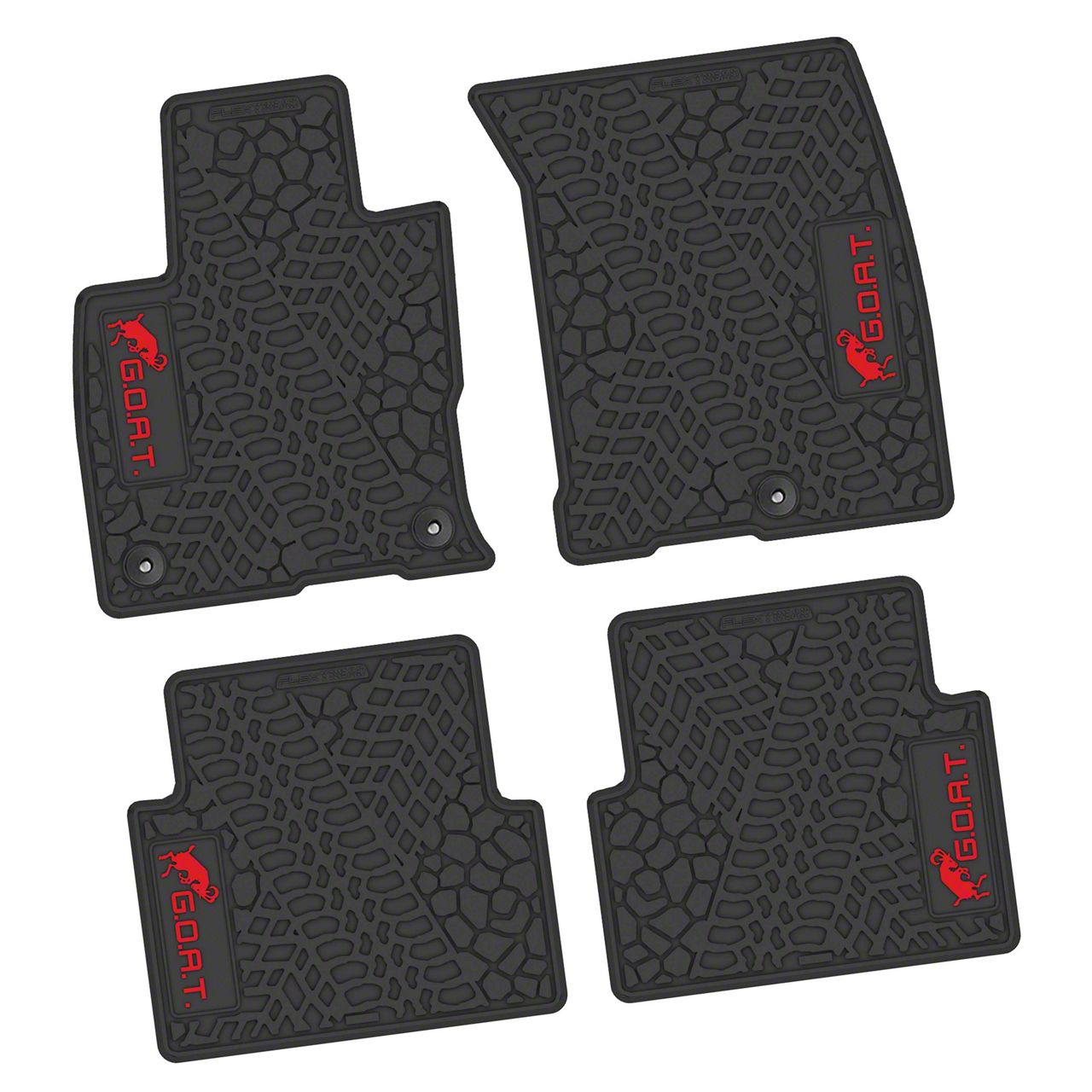Durable Floor Safeguard. Floor Mats are designed to protect your vehicle’s interior from the rigors of daily use, maintaining a clean and sharp appearance. Engineered for a stock floorpan fit in 2021-2026 Ford Bronco Sport models, these mats combine superior defense with a distinctive look. The matte black finish, matte red GOAT logo insert, and bold tire tread and scorched earth scene design ensure these mats offer both visual appeal and maximum protection for your carpet.