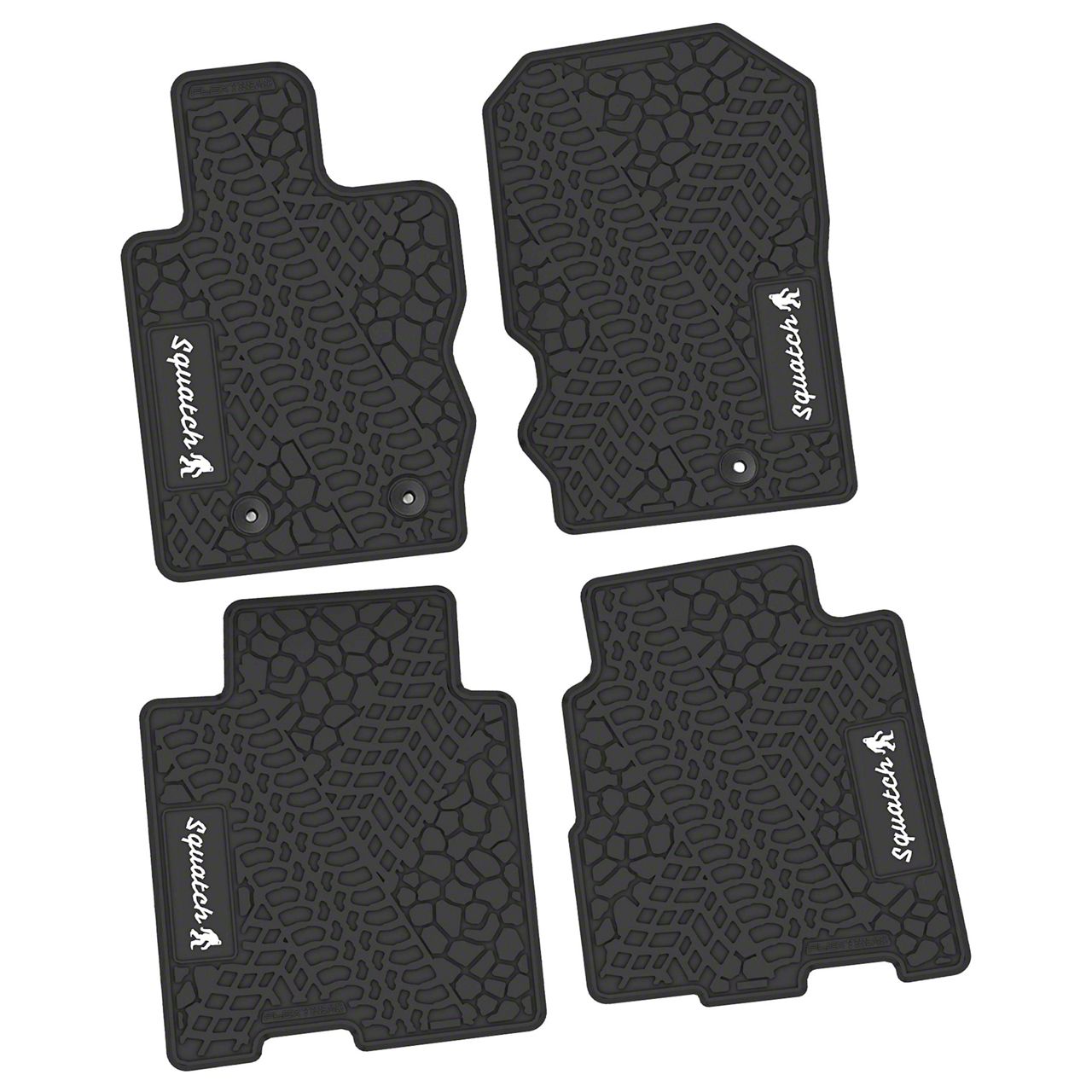 Factory Floorpan Fit Tire Tread/Scorched Earth Scene Front and Rear Floor Mats with White Squatch Insert; Black (21-26 Bronco 4-Door)Find parts that fit my vehicle