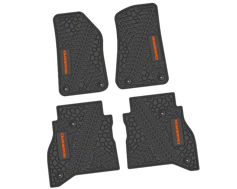 Application. These FLEXTREAD Factory Floorpan Fit Tire Tread/Scorched Earth Scene Front and Rear Floor Mats with Orange Gladiator Insert fit 2020-2026 Jeep Gladiator JT.