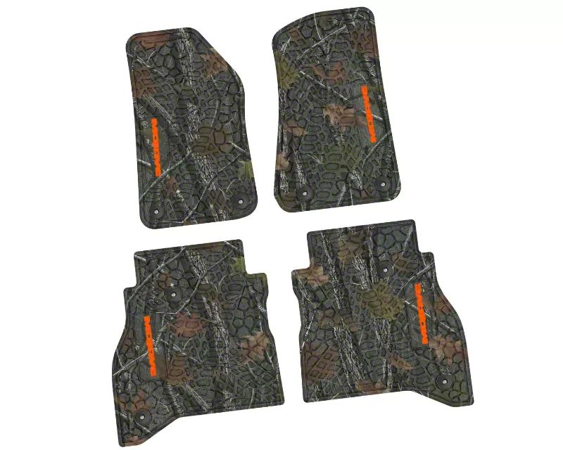 Application. These Factory Floorpan Fit Tire Tread/Scorched Earth Scene Front and Rear Floor Mats with Orange Mojave Insert (Rugged Woods) fit all 2020-2025 Jeep Gladiator JT Models.