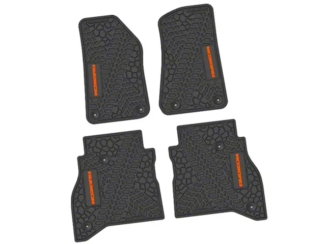 Rugged Interior Protection. The FLEXTREAD Floor Mats are tailored for 2020-2025 Jeep Gladiator JT models, providing exceptional interior floor protection. These mats feature a unique tire tread and scorched earth scene thread design that effectively traps and channels away water, dirt, mud, and other debris, keeping your vehicle’s floor clean and dry. The Hazard Orange Finish with a Rubicon logo insert adds a stylish, customized touch to your Jeep’s interior, while the anti-skid backing ensures the mats stay firmly in place.