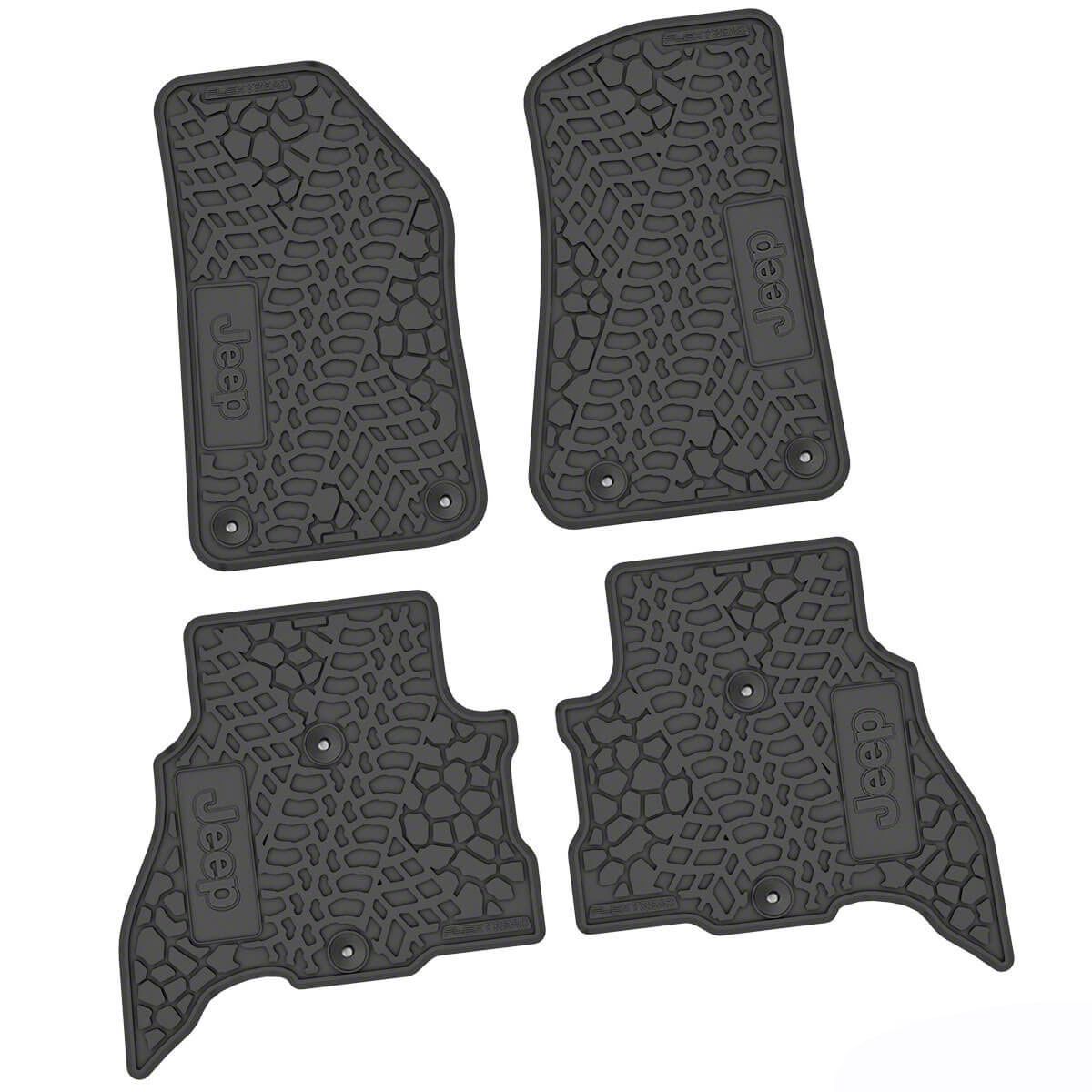 Installation. Putting these FLEXTREAD Factory Floorpan Fit Tire Tread/Scorched Earth Scene Front and Rear Floor Mats with JEEP Insert on your ride is easy and requires no drilling.
