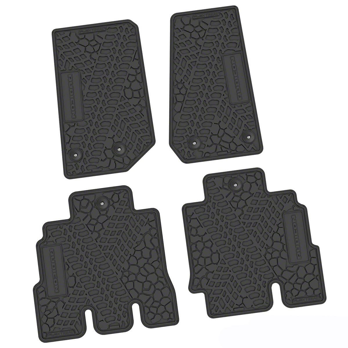 Factory Floorpan Fit Tire Tread/Scorched Earth Scene Front and Rear Floor Mats with Rubicon Insert; Black (14-18 Jeep Wrangler JK 4-Door)Find parts that fit my vehicle