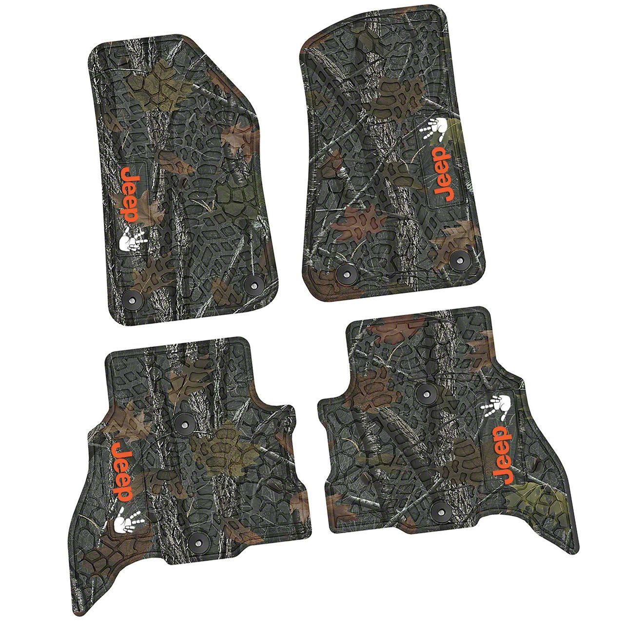 Factory Floorpan Fit Tire Tread/Scorched Earth Scene Front and Rear Floor Mats with Orange and White JEEP Wave Insert; Rugged Woods (21-26 Jeep Wrangler JL 4xe)Find parts that fit my vehicle