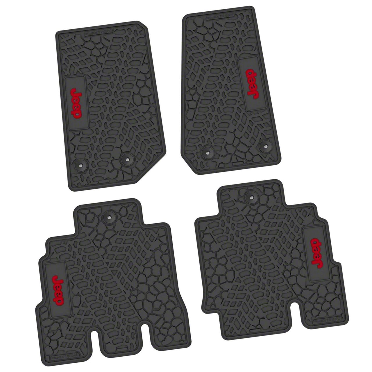 Application. These Factory Floorpan Fit Tire Tread/Scorched Earth Scene Front and Rear Floor Mats with Red JEEP Insert fit 2014 to 2018 Jeep Wrangler JK 4-Door.