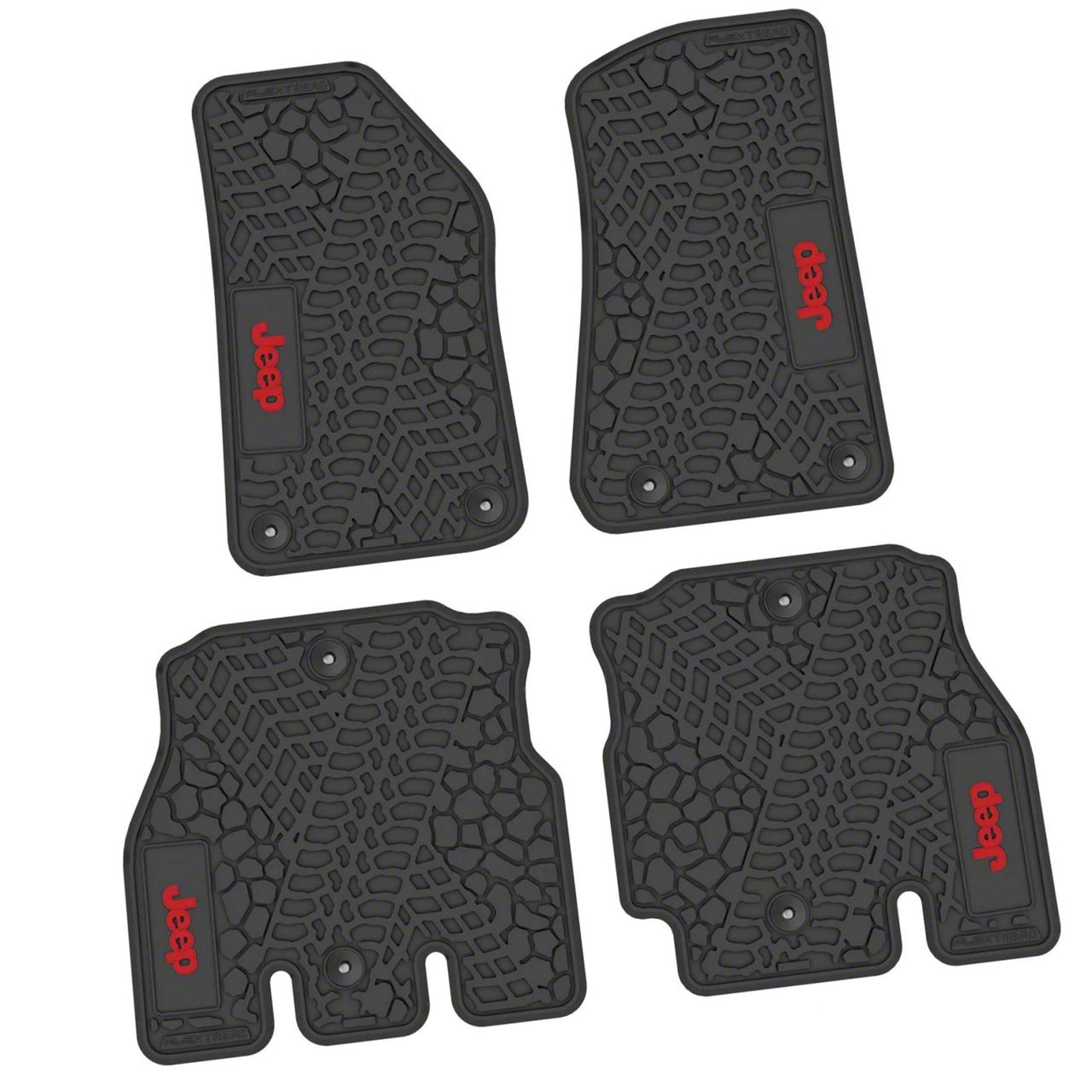 Design. Featuring a striking Red JEEP insert on a black background, these FLEXTREAD Factory Floorpan Fit Tire Tread/Scorched Earth Scene Front and Rear Floor Mats are aesthetically pleasing and match well with the vehicle's interior. The bold red accentuates the Jeep branding, creating a cohesive look that is both stylish and functional. This thoughtful color scheme complements the Jeep interior aesthetics while adding a personal touch that stands out.