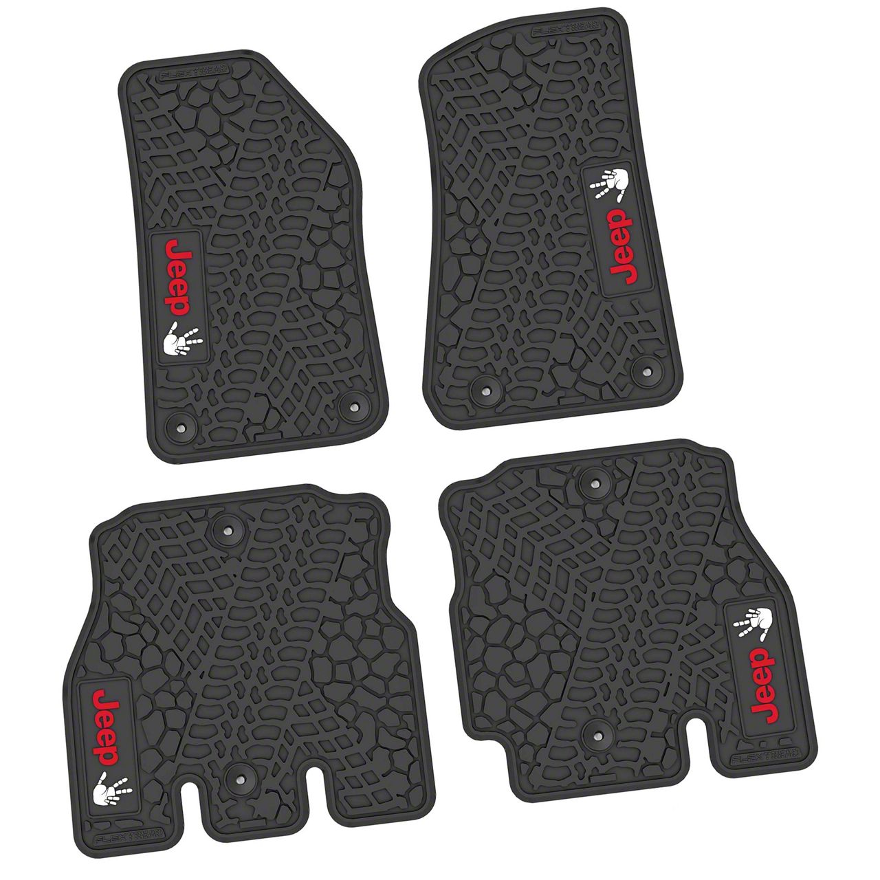 Application. These FLEXTREAD Factory Floorpan Fit Tire Tread/Scorched Earth Scene Front and Rear Floor Mats with Red and White JEEP Wave Insert (Black) fit all 2018-2026 Jeep Wrangler JL 4-Door Models, Excluding 4xe.