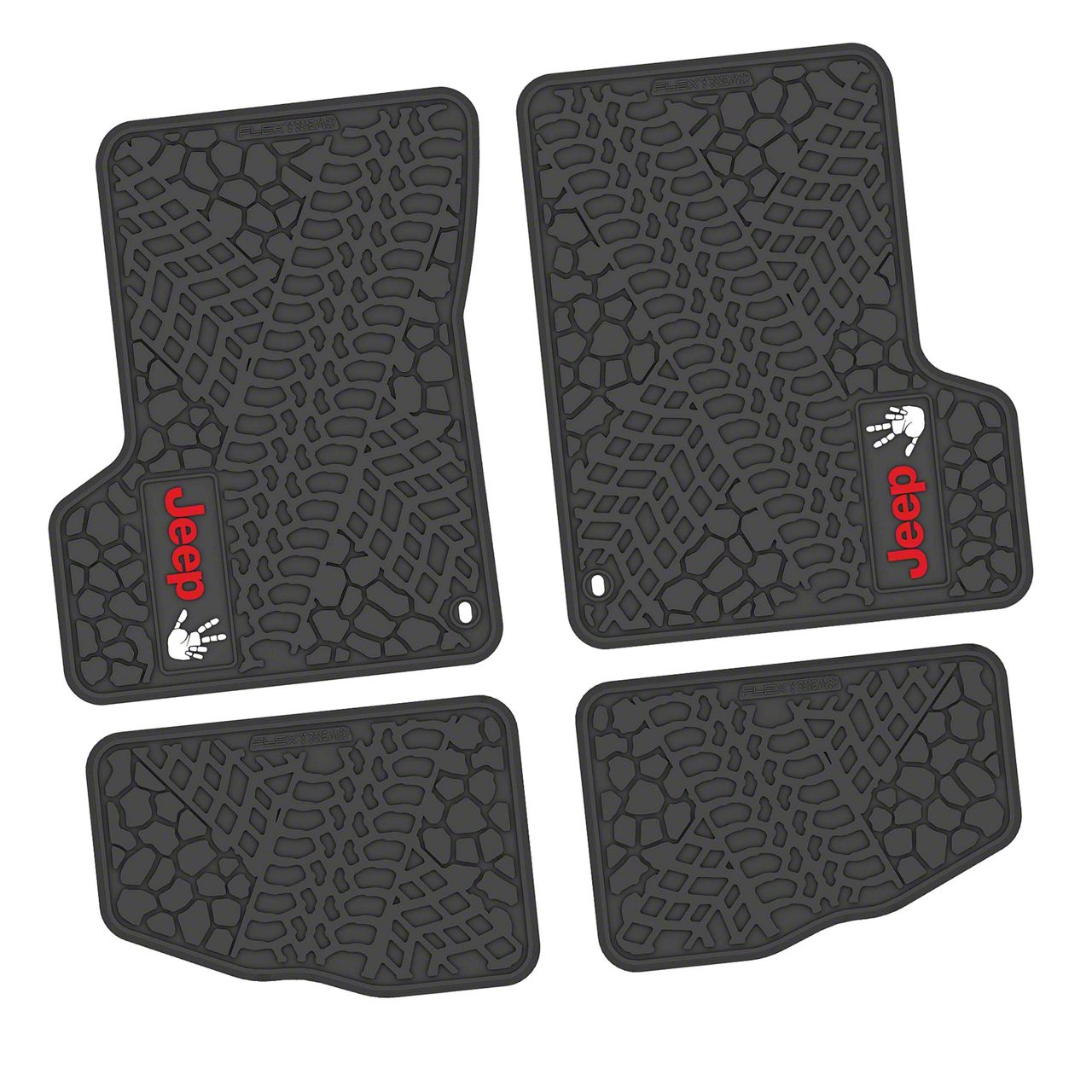 Construction and Appearance. Made in the USA, these floor mats are built from durable all-weather material that stands up to harsh conditions, including snow, sand, and trail debris. The red and white Jeep Wave insert adds a bold accent to the molded scorched earth terrain pattern, while the slip-resistant Sure-Grip backing and factory-compatible safety fasteners ensure the mats stay securely in place. Precision molded edges provide complete floor coverage and containment.