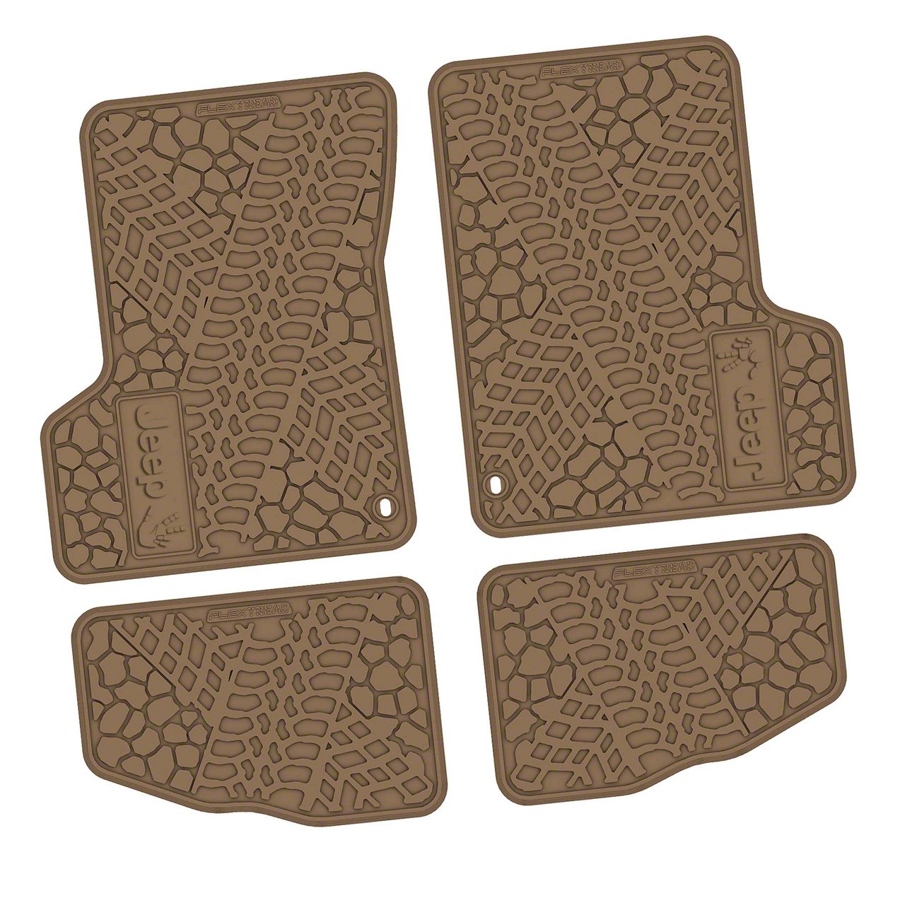 Durable All-Weather Protection. The FLEXTREAD Floor Mats are designed to offer unmatched protection for the interior of your 1997-2006 Jeep Wrangler TJ. Featuring a rugged tire tread and scorched earth scene design, these mats not only shield your stock carpeting from spills, dirt, and debris but also enhance your Jeep's adventurous aesthetic. The included JEEP Wave logo insert adds a signature touch.
