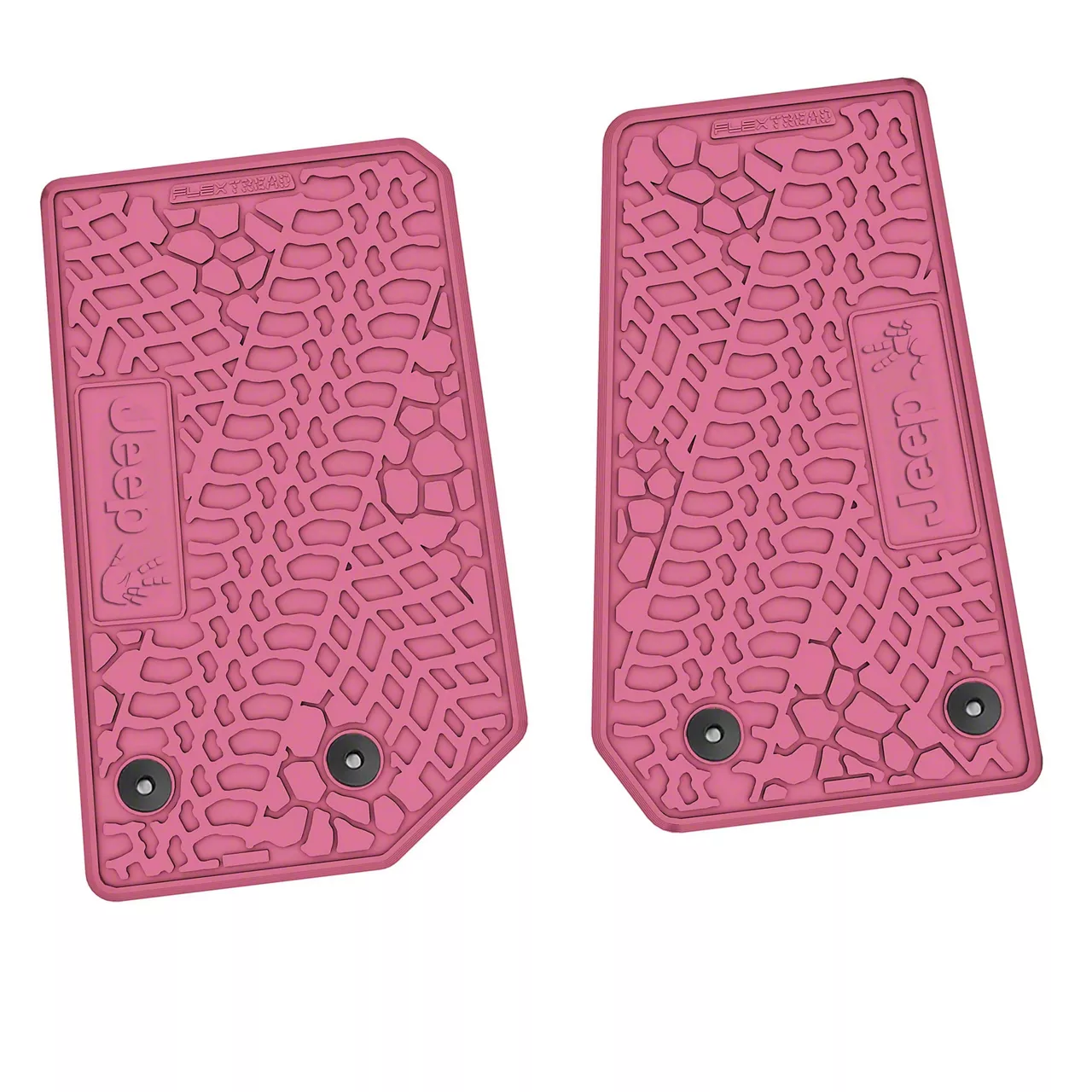 All-Weather Protection With Trail-Inspired Style. These Factory Floorpan Fit Tire Tread/Scorched Earth Scene Front Floor Mats with JEEP Wave Insert offer durable, custom-fit floor protection for your 2014 to 2018 Jeep Wrangler JK 2-door. Featuring a unique scorched earth and tire tread design with a vibrant pink JEEP Wave emblem, these mats deliver rugged functionality and bold interior flair while trapping mud, water, and debris.