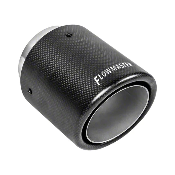 Construction and Appearance. Built for both durability and visual appeal, the Flowmaster Exhaust Tip features a double wall, angle cut design. The glossy black carbon fiber finish is paired with a rolled carbon fiber exterior and a 304S stainless steel inner core, providing corrosion resistance and long-lasting performance. This robust construction ensures a high-end, race-inspired appearance that holds up under high-heat conditions.