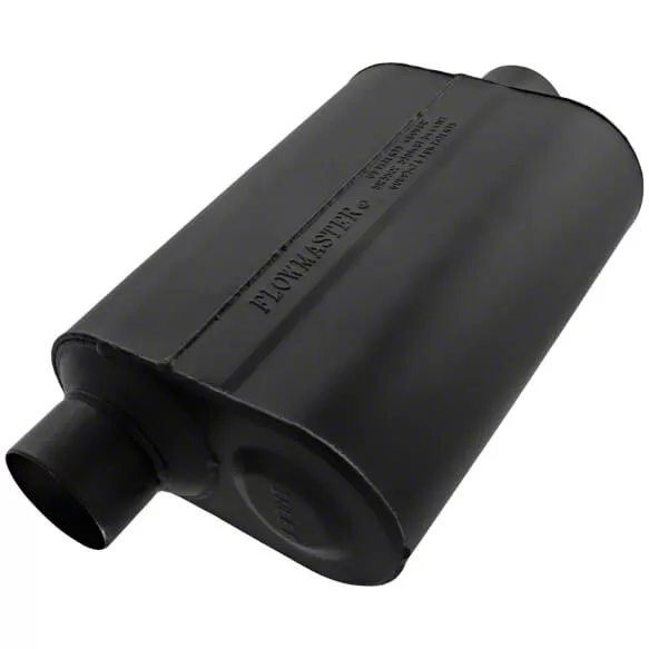 High-Performance Part. The Flowmaster Super 40 Series Offset/Offset Oval Muffler will help you take the performance of your vehicle to the next level. With MaxPower Gains of Up to 12.4 hp and 13.8 pound/ft of Torque, this Center/Dual Out Oval Muffler was designed to provide additional power for your vehicle.