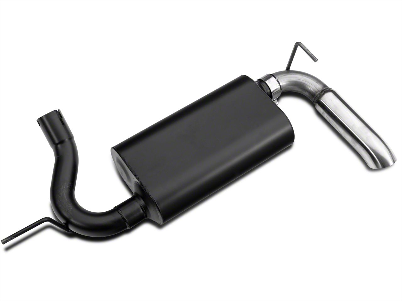 Design. This axleback exhaust system includes a 2.5-inch tubing (which connects to the muffler), the powerful Super 50 Series muffler, a single rear exit and a 3-inch tip that leads to open air for the exhaust gases to exit.