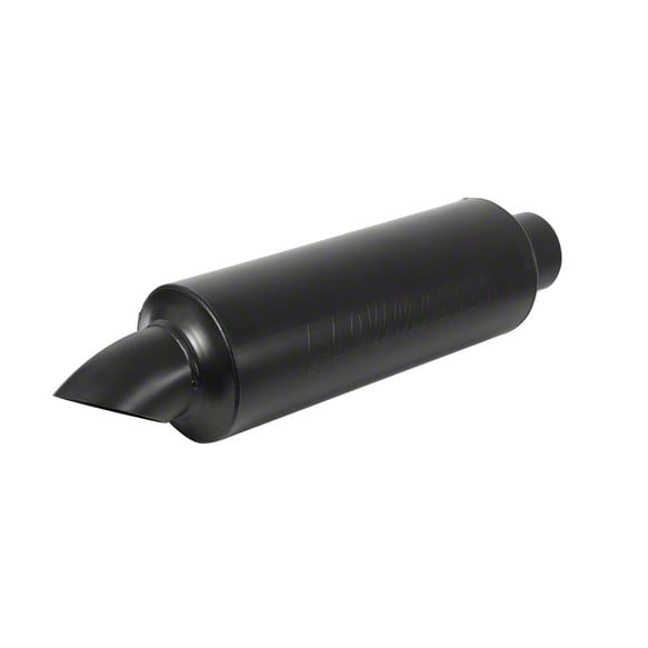 Turn Down Outlet. Featuring a built-in turn down, this Flowmaster Pro Series 16-Inch Center/Center Round Muffler with Turn Down; 3.50-Inch Inlet/3.50-Inch Outlet directs exhaust flow toward the ground, reducing drone and providing a more controlled exhaust note. It’s a practical feature for both street and race applications.