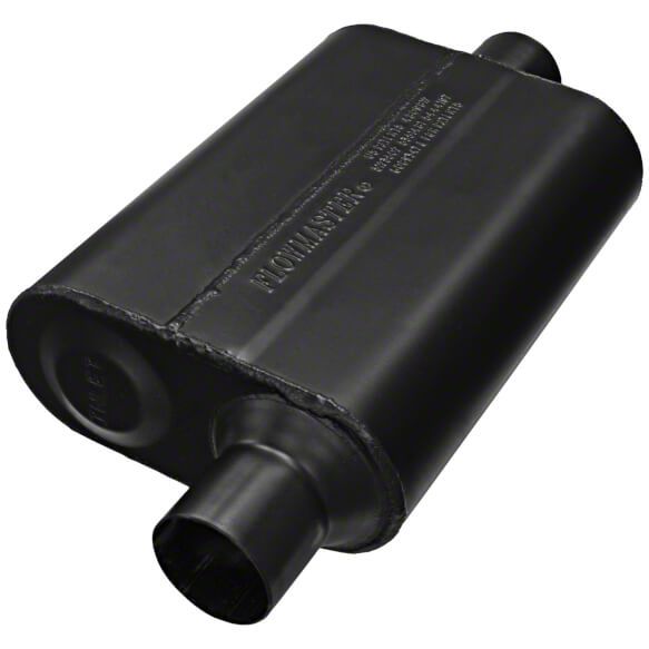 Complex Exhaust Tone. The Flowmaster Super 44 Series Offset/Center Oval Muffler; 2.25-Inch Inlet/2.25-Inch Outlet is ideal if you desire a deeper and less noticeable exhaust noise for your big truck. designed to reduce droning and dissipate loudness, providing a richer and more complex growl when you press the gas pedal.