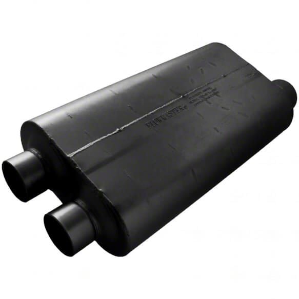 More Power And Less Noise. With the Flowmaster 50 Series Big Block Dual In/Offset Oval Muffler, you get substantial gains to horsepower and torque with reduced cab noise. This muffler has a chambered internal construction, allowing it to create a mild exterior tone while reducing interior resonance. Many drivers find that the muffler provides them with mileage gains, allowing them to get more out of their fuel.