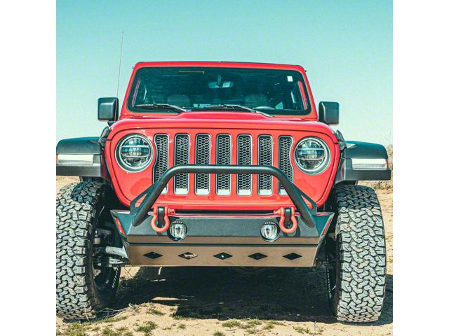 Description. The Fly Offroad Jeep Front Bumper is the perfect addition to your Jeep Wrangler or Gladiator. Made in the USA with high-quality materials, this bumper is designed to provide maximum protection and style. The Mid-Stubby design allows for additional tire clearance required to run 40” tall tires on the trail. The stamped end caps provide added strength to the ends of the bumper, while also adding a cool design element. The integrated light tunnels allow for the installation of factory fog lights or similar sized aftermarket LED lights. The fully welded grille guard hoop is manufactured from high strength 1.5” diameter.125 wall thick DOM steel tubing. Dual recovery points are fully welded to the strongest part of the bumper and vehicle, at the frame horn area. The bumper is available in two finishes: unpainted for custom paint matching or textured black powder coat. Our optional skid plate is also available for ultimate front-end protection.