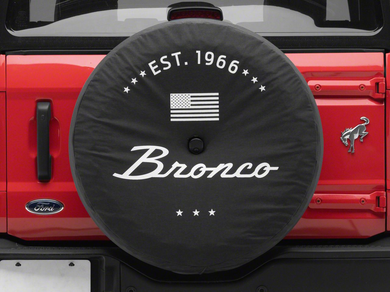 Tire Protection. Make a style statement on your Bronco while protecting your spare with the Ford 32-Inch Spare Tire Cover with Bronco 66 Logo; Black. Crafted from robust materials, the cover ensures your spare tire remains protected from harsh weather conditions, road debris, and harmful UV rays. It proudly displays the vintage Bronco 66 logo in a sharp contrast against its black background, enhancing the rugged aesthetics of your ride.