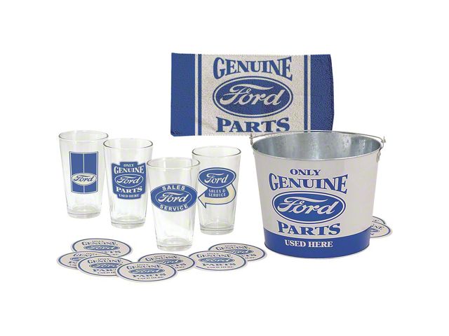 A Full Bar Set. You’ll have everything you need for enjoying the bar with your buddies with the Ford Pint Glass Gift Set. The 18-piece set includes 4 pint glasses, 12 coasters, a 5-quart metal bucket for ice or beer, and a 100% terry cotton towel. Each piece is proudly emblazoned with a Ford Genuine Parts logo.