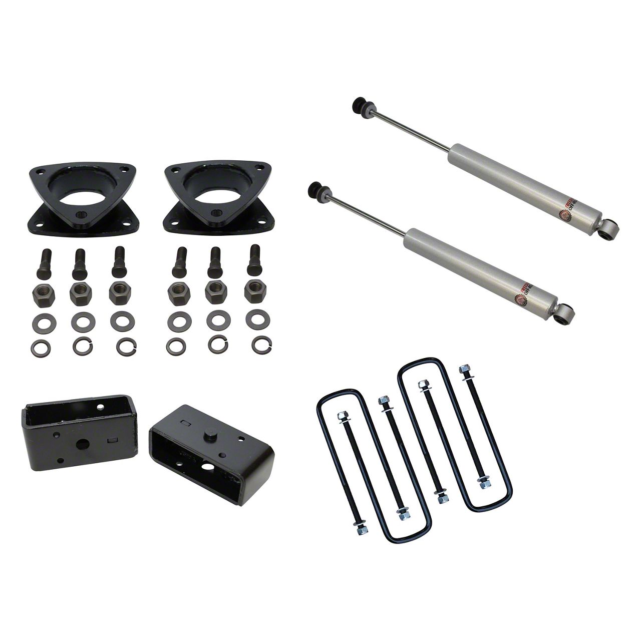 Steel Lift Blocks and Spacers. Providing the lift for this Freedom Offroad 3-inch Suspension Lift Kit are front lift spacers and rear lift blocks. These lift blocks and spacers are manufactured from carbon steel, allowing them to stand up to the most unforgiving driving conditions.