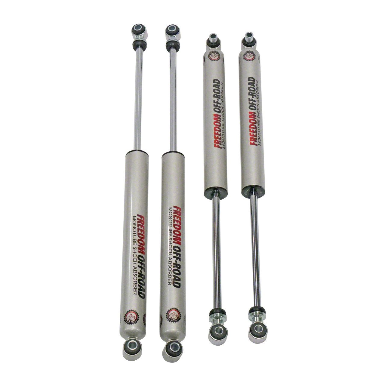 Enhanced Suspension Performance. The Freedom Offroad Shocks are built to elevate the suspension performance of your 2020-2026 Jeep Gladiator JT with 2.50 to 4.50 inches of lift. Designed to improve control and ride comfort on and off the road, these shocks deliver outstanding handling and stability for lifted vehicles. With their front and rear coverage, they ensure a balanced and smooth driving experience.