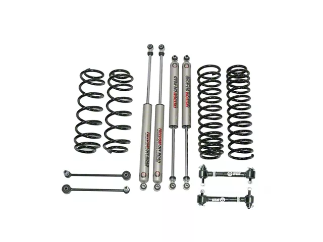 Freedom Off-Road's 4" Lift Kit with Monotube Shocks is designed to elevate your off-road experience. This kit provides a substantial ground clearance and allows for larger tires, which is perfect for tackling rugged terrain. The included monotube shocks offer superior performance with improved responsiveness and heat dissipation, ensuring a smoother and more controlled ride. Built for durability and consistent damping, this lift kit is an excellent choice for off-road enthusiasts looking to upgrade their vehicle's suspension system. Our cold-wound coil springs are engineered to maintain factory ride quality, ensuring comfort on and off the road for a lifetime of use without sagging. Additionally, the extended sway bar end links maintain proper sway bar alignment, enhancing vehicle stability and suspension articulation