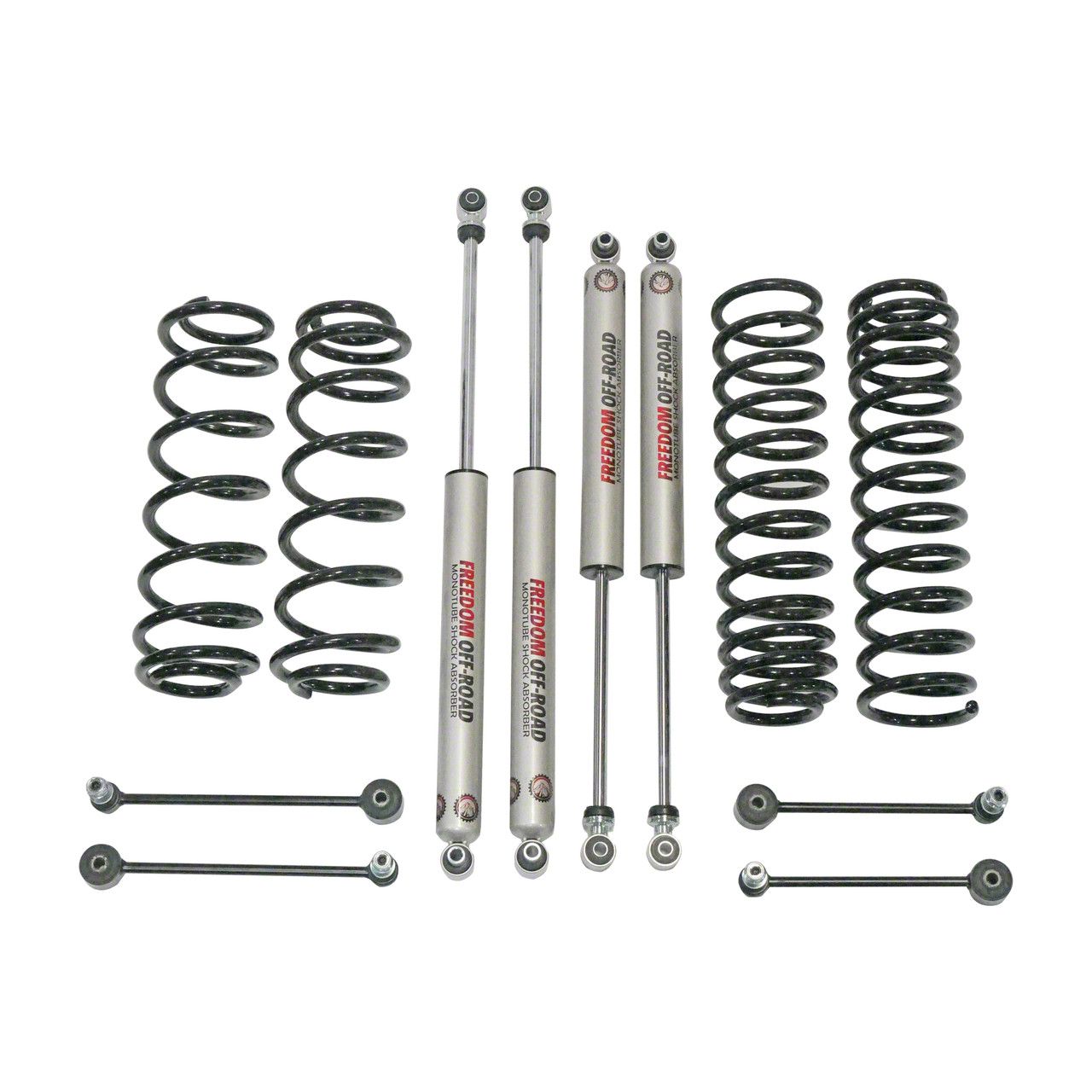 Enhanced Ground Clearance and Stability. The Freedom Offroad 4.50-Inch Suspension Lift Kit is designed to elevate your Jeep Wrangler JL's off-road prowess. This kit delivers an impressive 4-inch lift, improving ground clearance and enabling your vehicle to tackle rugged terrains with ease. Its extended sway bar end links ensure proper articulation, providing better stability during challenging off-road maneuvers. Paired with monotube shocks, this Freedom Offroad 4.50-Inch Suspension Lift Kit ensures exceptional performance and control on all types of trails.