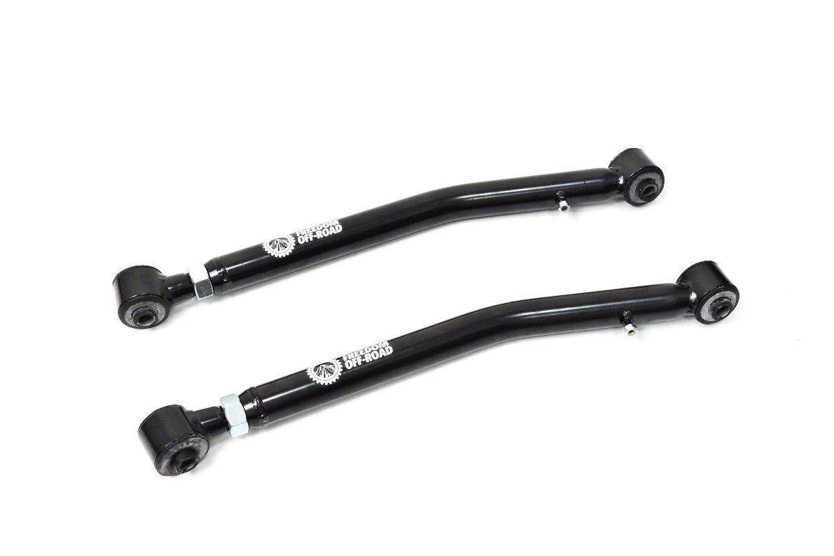 Stability and Flexibility. Take your Jeep Wrangler JL to new heights and terrains with the Freedom Offroad Adjustable Front Lower Control Arms for 0 to 4-Inch Lift. Experience improved driving stability and articulation flexibility with heavy-duty bushings that absorb vibrations and enhance ride comfort. The adjustable length allows for precise alignment adjustments, ensuring optimal performance and handling regardless of your car's lift height. The corrosion-resistant coating on each control arm protects against the elements, making them a dependable choice for all your adventures.