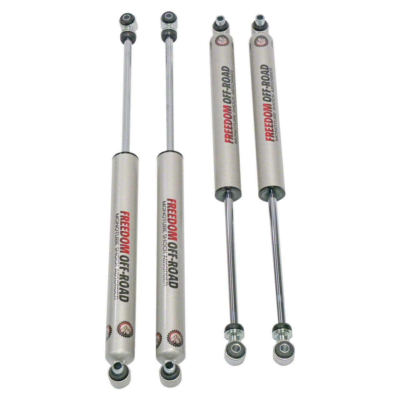 High-Performance Monotube Shocks. The Freedom Offroad Front and Rear Monotube Shocks are designed to enhance ride quality and control for Jeep owners with 2.5 to 4.5-inch lift kits. Featuring a high-performance monotube design, these shocks provide improved damping for a smoother ride on highways while offering excellent off-road performance for rugged terrain.