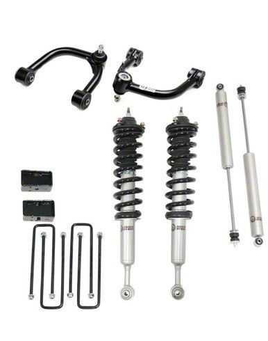 Construction and Appearance. Each component in this kit is engineered from durable materials and finished in a mix of glossy black, matte black, and raw metal tones. The coilover struts and upper control arms offer structural integrity and suspension stability, while the heavy-duty lift blocks and U-bolts are designed to withstand the demands of off-road driving and payload support.