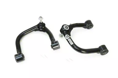 Construction and Appearance. Featuring a durable matte black finish, these heavy-duty upper control arms are designed to withstand demanding conditions. Equipped with pre-greased ball joints and hardened rubber bushings, they offer smoother movement and reduced wear over time. The components ensure precise alignment and an improved driving experience, making them a valuable upgrade for lifted Tacoma models.