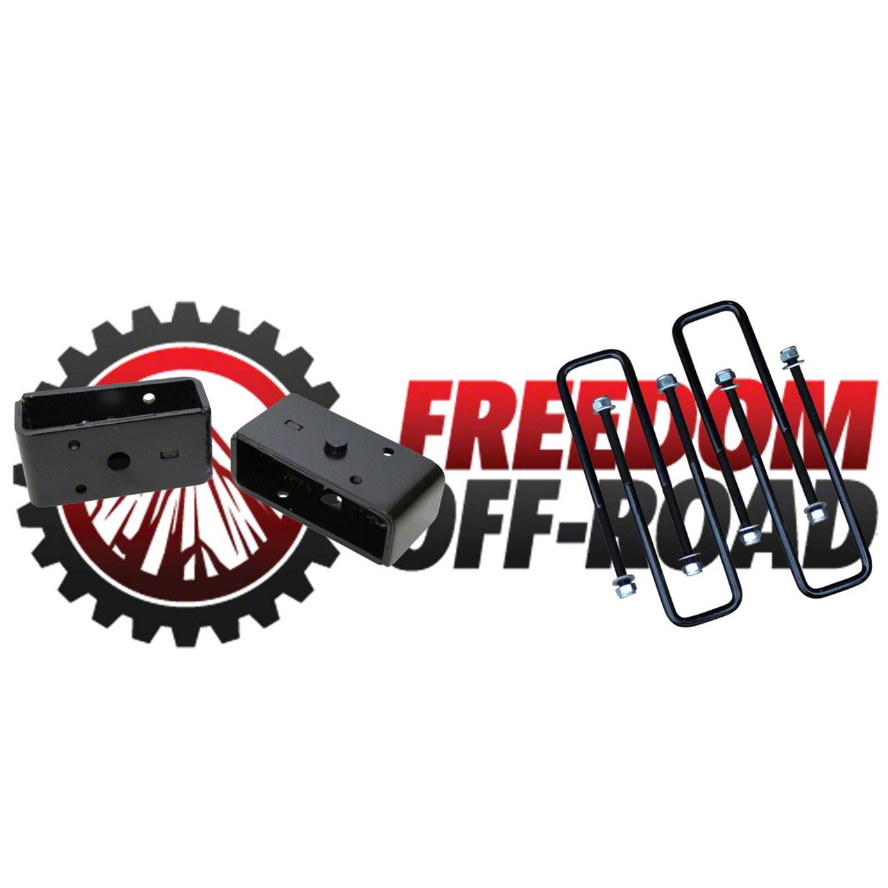 Installation. Installation of these Freedom Offroad 2-Inch Steel Rear Lift Blocks is moderately easy and may require drilling. It is recommended to have a professional install them to ensure proper fit and safety.